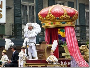 The one we wanted to see was the Okeanos which was named after the Greek God of rivers, Okeanos. There are so many different parades each with their own history and tradition but this is one that still resembles the older style New Orleans parades. It is a good, old-fashioned, traditional parade that inspired us to join in with the Mardi Gras spirit. I should mention here that each of the parades is affiliated with a Krewe, or a group of people who support and fund much of the parade and the “throws”(stuff like beads, coins, toys, etc.) thrown by costumed characters riding on each float. Okeanos was founded in 1950 and with more than 250 male and female riders, it is known for its elaborately costumed captain and king.